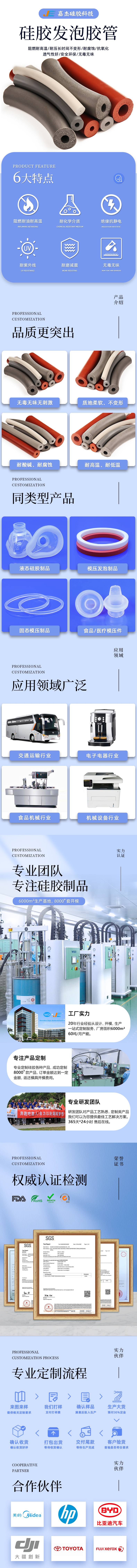 另外發泡類產品還有硅膠海綿帶、硅膠海綿條等。深圳嘉杰是廣東專業硅膠制品生產制造供應廠商,海綿類產品是我廠一特色主打產品,各種規格均可定制,另還定做防水硅膠密封條等各種硅膠條系列產品。